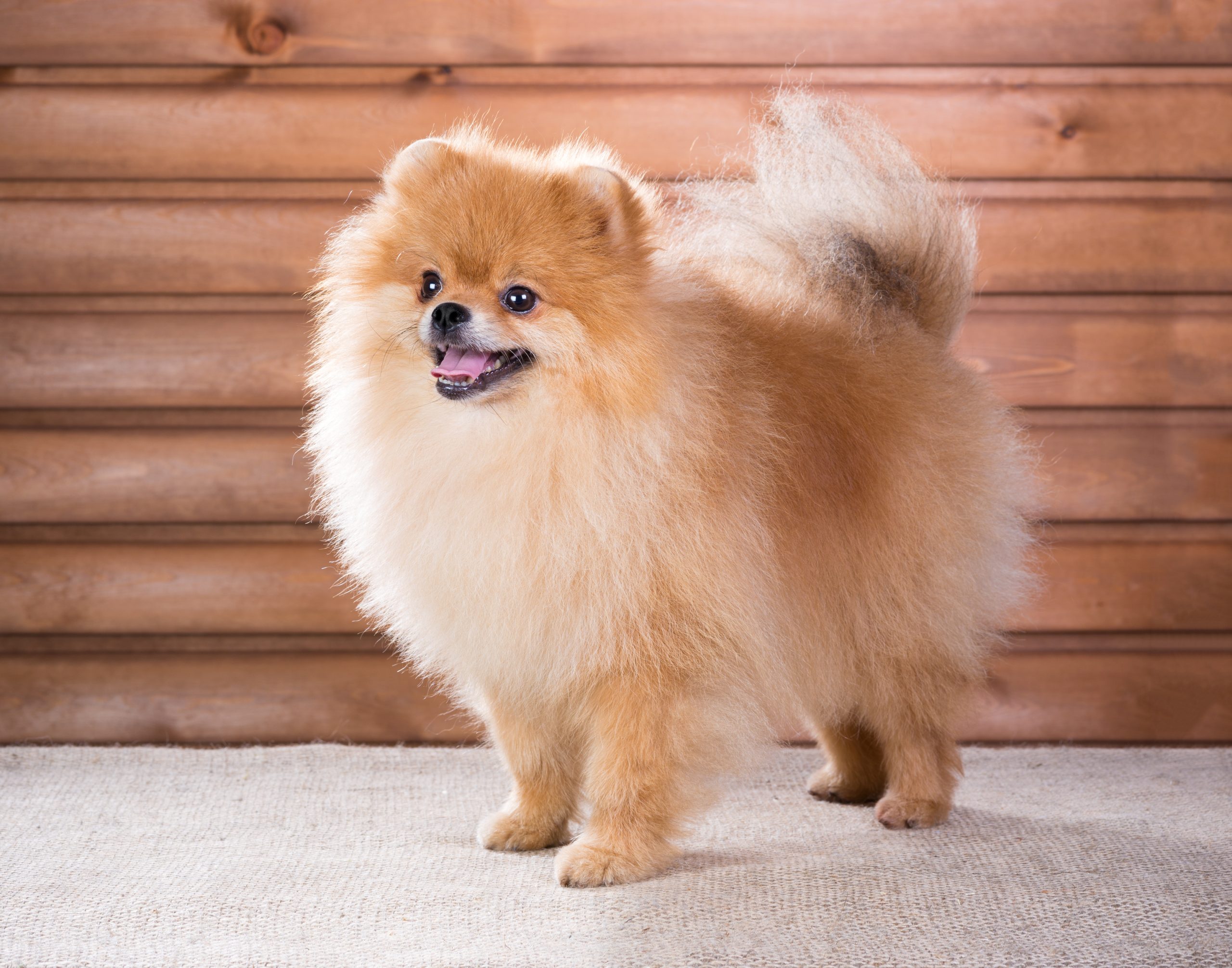Studio portrait Pomeranian dog on a background wooden wall
