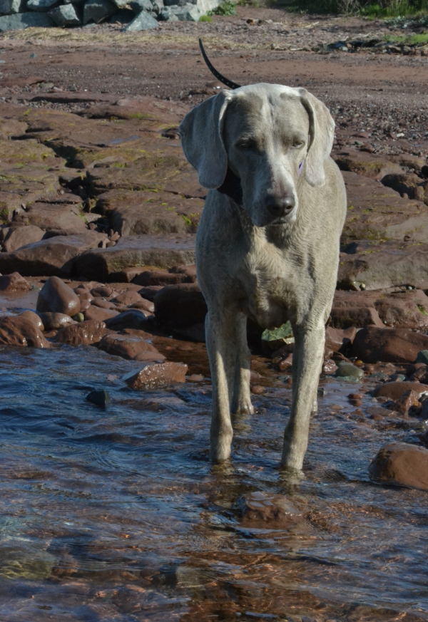 Like many other breeds, Weimaraners can gray in the muzzle as they age, but Weims have a unique characteristic that isn’t typical of all breeds. As they age, some are known to get a lighter patch of color between their ears and on the back of their head that might extend over the forehead and lighten until it’s almost white. This is known as a “Grafmar’s Cap,” the name coming from an early and influential kennel. Below are photos generously provided by readers: