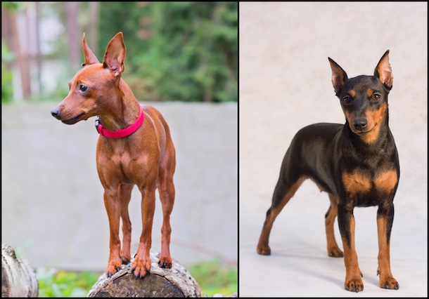 Image: Photo of Miniature Pinscher on white background by ©Alexandr Ryzhov/Dreamstime;Photo of stag red Miniature Pinscher from Deposit Photo