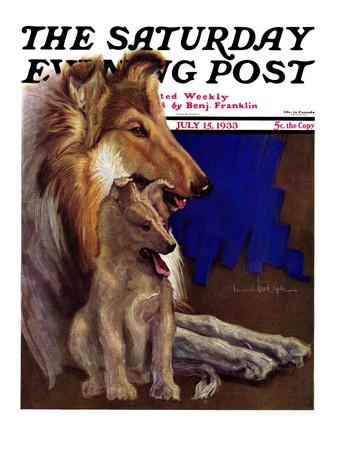 Collies appeared on several Saturday Evening Post covers. There was the Saturday Evening Post cover from 1927, Dogs Life by Robert L Dickey, and one by Howard Van Dyke from 1933. “Dog Days of Summer” by John Clymer appeared on a cover in 1955, and his “Swimming in the Creek” was done in 1959 (some say this is a Border Collie). Clymer also did “Gathering Wood” in 1961; From 1953, Stevan Dohanos’ Saturday Evening Post cover, New Dog in Town.