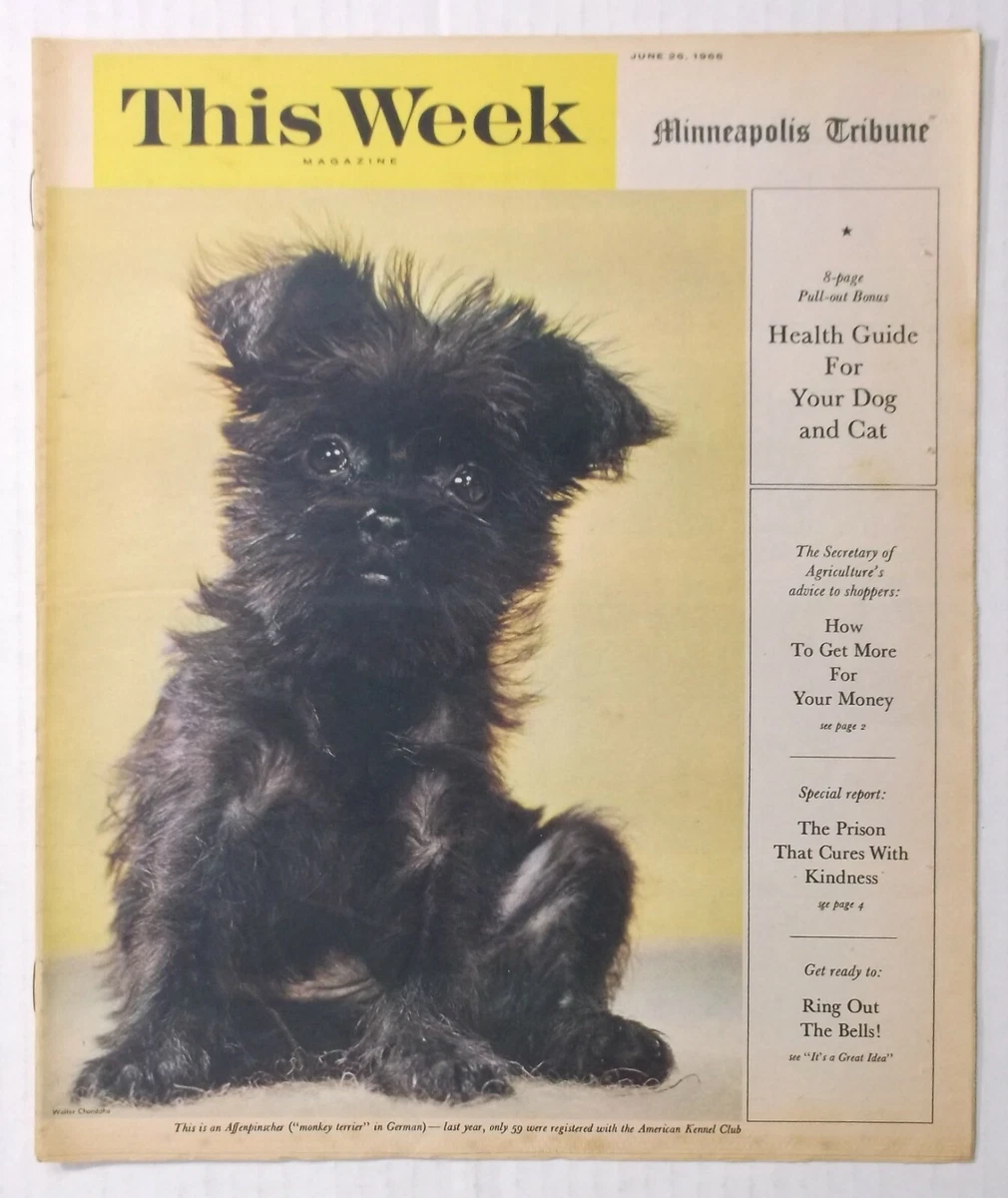 Dachshunds, Basset Hounds, Bulldogs, and Weimaraners made appearances, and while those popular breeds probably didn’t need to be introduced to a general public, a lesser known breed like the Affenpinscher did. In 1966, a year after the Affenpinscher Club of America was formed, This Week put an Affen pup on its cover which gave the breed much needed publicity.