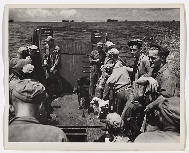 Aboard a Coast Guard-manned landing barge, Marines and their fighting “Devil Dogs” are on their way for the invasion beaches of Guam. Source: U.S. Coast Guard Public Relations Photo/public domain