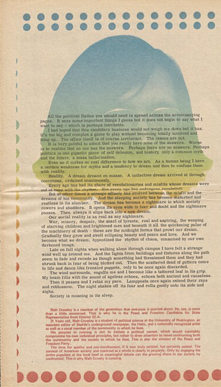 A portion of the “Community Not Chaos” poster by Walt Crowley from 1968.Listed by Wikicommons as being in the public domain