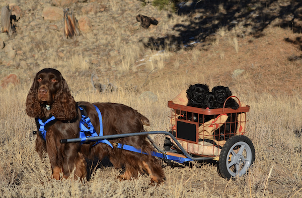 Our image is of “Mozzie,” a Field Spaniel with a basket full of PWD puppies. Mozzie was the first Field Spaniel with a draft title. Our thanks to Heather Hill Fiedler for sharing the photo with us back in 2023
